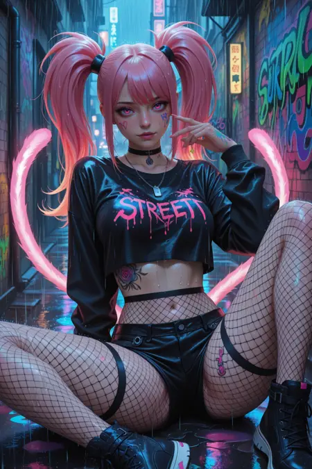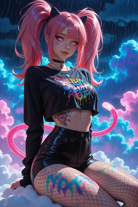 stunning young woman, neon pink twin-tail hair, sitting, floating on a cloud, stylish edgy streetwear, black long sleeved croptop, fishnet tights, graffiti-style tattoos on chest, arms, and thighs, detailed colorful graffiti art on her skin , expressive pose, confident and seductive, choker necklace, vibrant colors, cinematic lighting, heavy rain, immersed in glowing clouds, dreamy clouds background, hands behind her back, from behind,nice ass