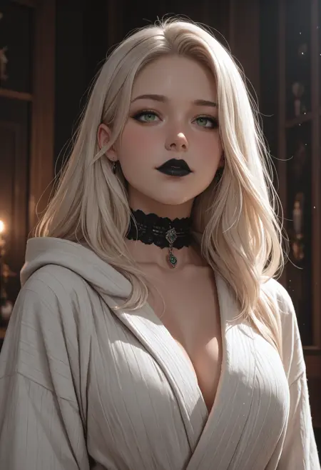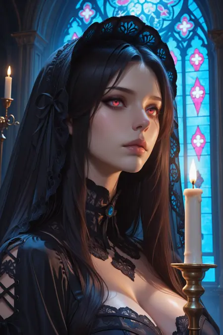 portrait,(8k, best quality, ultra high res, photorealistic, masterpiece, ultra-detailed, Unreal Engine), absurdres, best quality, 1girl, solo, wearing a black lace gothic dress with corset details, long flowing sleeves, standing in a candlelit cathedral, stained glass windows glowing in the background, dramatic shadows, ethereal gothic atmosphere