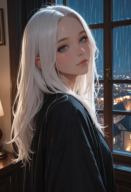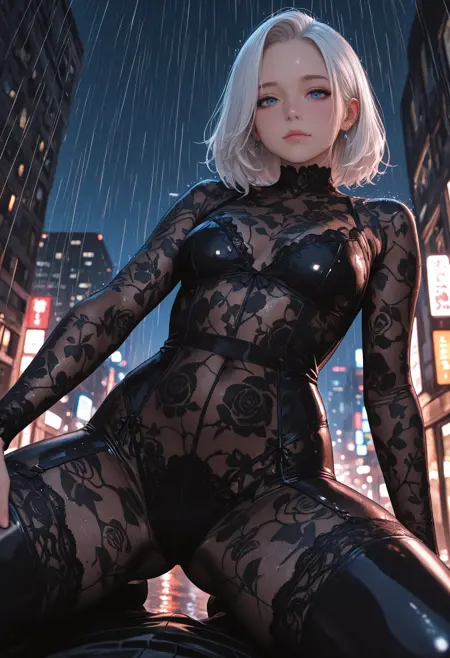1girl,solo,white hair, black sheer and lace bodysuit,rose pattern, night time, city lights, rain,blue eyes, closed mouth, crawling, straddling the viewer, BREAK,low angle, from below,POV perspective