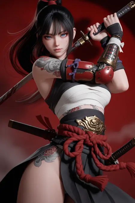 3D 3D render CGI (dynamic pose, dynamic angle:1.5),masterpiece,best quality,high quality,newest,highres,absurdres,Sinozick_illu,1girl,weapon,sword,black hair,solo,katana,long hair,blood,blue eyes,breasts,sarashi,looking at viewer,earrings,bandages,piercing,ear piercing,jewelry,blood on face,bangs,mechanical parts,