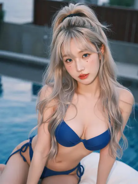 The image is a portrait of a woman with long, wavy platinum blonde hair pulled back, natural DD Breasts and tanned skin, (tan lines: 1.2), she is wearing tight blue bikini, sitting poolside at an upscale resort, The woman is looking directly at the camera and posing with a playful expression on her face, (flashing:1.3), (nipples), (female pubic hair: 1.3), (pubic hair), pulling clothes, pulled aside, The background is blurred, making the woman the focal point of the image. The lighting is soft and natural, highlighting her features., 1girl, solo, long hair, realistic lips, looking at the viewer, blue eyes,
