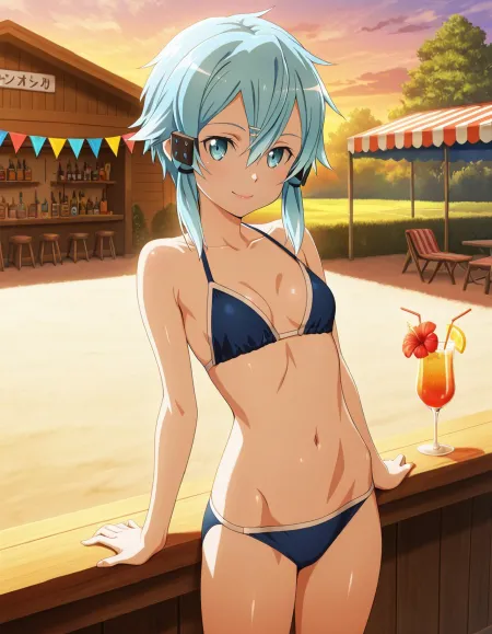 \(\(best quality\)\), \(\(masterpiece\)\), 1girl, solo, petite, peaceful with a soft smile, leaning back with arms at sides, navy blue bikini with modest cut, striped, makeup, lipstick, backyard bar setup with bunting, holding a festive drink with a tiny flag, golden hour with gentle wind, Sinon, Sinon \(Sao-Alo\), <BREAK> masterpiece, best quality, absurdres, highres, very aesthetic, high quality, detailed, insanely detailed, , anime screencap, (vivid:1.2),(extreme-detailed), cute face, clear skin , shiny hair, beautiful eyes