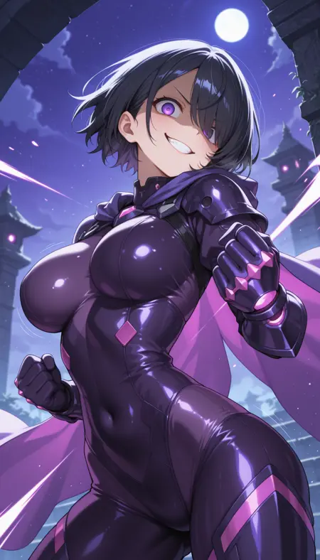 masterpiece, best quality, amazing quality, very aesthetic, high resolution, ultra-detailed, absurdres, newest, scenery, official art, 1girl, v-shaped eyebrows, (shaded face:1.2), smug, (evil grin:1.2), crazy smile, fangs, teeth, wide-eyed, large breasts, short black hair with sideswept bangs, [purple eyes:empty eyes:12], crazy eyes, hair over one eye, swinging glowing sword, detailed purple obsidian bodysuit, glowing purple cape, armored detailed purple gauntlets, overgrown stone temple, purple night sky with moon, fine fabric emphasis, dutch angle, from below, dynamic action pose, (face focus:1.2), close-up, portrait, upper body, looking at viewer, (speed lines, motion blur, motion lines, attack trail:1.3), fisheye, BREAK, eyes, hands, fingers, detailed eyes, masterpiece, best quality, amazing quality, very aesthetic, high resolution, ultra-detailed, absurdres, newest, scenery, depth of field, volumetric lighting