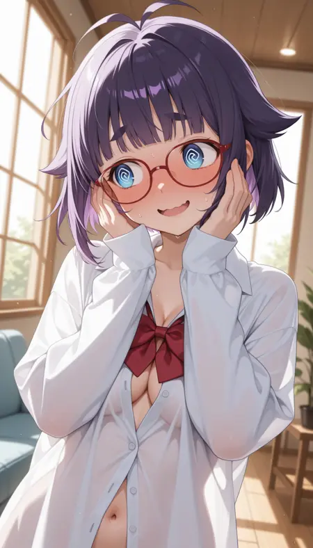 masterpiece, best quality, amazing quality, 4k, very aesthetic, high resolution, ultra-detailed, absurdres, newest, scenery, 1girl, solo, purple hair, medium bob, choppy blunt bangs, sidelocks, hair flaps, antenna hair, blue eyes, round eyes, tareme, smile, open mouth, wavy mouth, raised inner eyebrows, (round eyebrows:1.2), full-face blush, @ @, sweatdrop, medium breasts, round red-framed glasses, loose oversized collared white shirt sleeves past wrists, loose tilted red bowtie, collarbone, messy hair, looking away, embarassed, arms behind back, shrugging, arched back, window, dappled sunlight, back light, rim light, see-through_silhouette, upper body, (head tilt:1.2), facing up, facing another, dutch angle, BREAK, delicate hair, volumetric lighting