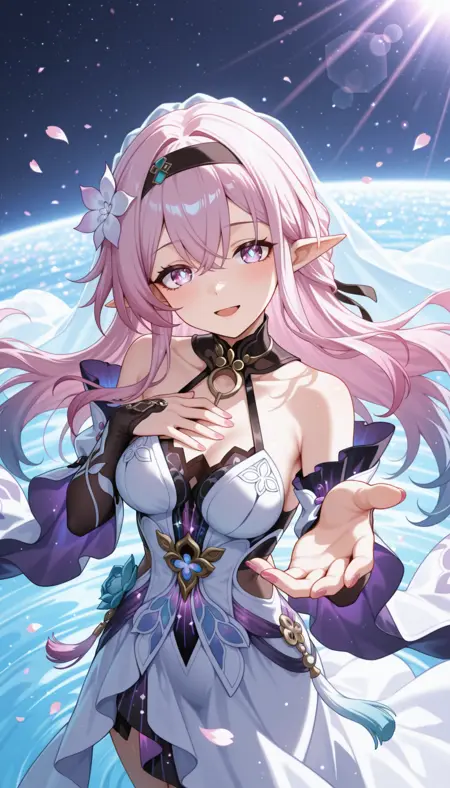 masterpiece, best quality, amazing quality, very aesthetic, high resolution, ultra-detailed, absurdres, newest, scenery, colorful, rim light, backlit, dynamic from below dutch angle, highest detailed, upper body, cosmic sky, aurora, chaos, fashion photography of busty cute girl, (cute:1.2), intense long pink hair, long hair, rimlight (purple:0.7) nebulae cosmic eyes, dynamic pose, bokeh, purple serafuku with big red ribbon, (red annular solar eclipse:1.3) passing through hair, perfect night, fantasy background, looking at viewer, light smile, perfect hand, reaching, (colorful light particles:1.2), (face focus:0.7), hand focus, BREAK, hands, fingers, eyes, detailed background, blurry foreground, extremely detailed eyes, masterpiece, best quality, amazing quality, very aesthetic, high resolution, ultra-detailed, absurdres, newest, scenery, depth of field, volumetric lighting