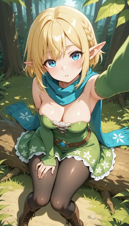 masterpiece, best quality, amazing quality, 4k, very aesthetic, high resolution, ultra-detailed, absurdres, newest, scenery, colorful, saturated, anime, anime coloring, 1girl, solo, elf girl, blonde hair, medium bob, long sidelocks, braid, long pointy elf ears, pixie, looking at viewer, blue eyes, upturned eyes, parted lips, blush, floral print blue scarf, medium breasts, leaf print puffy wide detached green sleeves past wrists, narrow waist, wide hips, thick thighs, cross-laced pixie green frill lace strapless (leotard:0.8) long dress, skindentation see-through black pantyhose, brown lace-up knee boots, head tilt, sitting on log, knees together feet apart, arched back, outstretched arm up reaching towards viewer, hand out of frame, hand on own thigh, dutch angle, from above, upper body, portrait, close-up, head focus, (foreshortening:1.2), fine fabric emphasis, leaf, forest, ground, dappled sunlight, lens flare, BREAK, depth of field, volumetric lighting