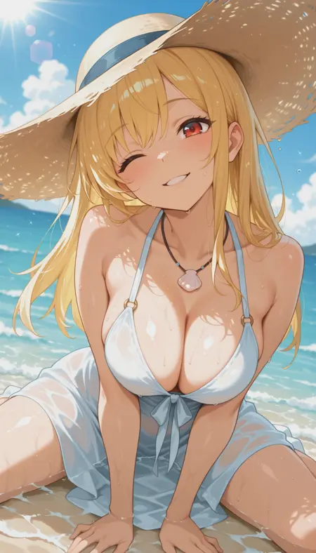 masterpiece, best quality, amazing quality, 4k, very aesthetic, high resolution, ultra-detailed, absurdres, newest, scenery, sensitive, 1lady, face focus, blonde hair, long hair, looking at viewer, red eyes, upturned eyes, one eye closed, smile, parted lips, large breasts, white flowy maxi dress, partially submerged, wide-brimmed hat, shell necklace, fingers, hands on floor submerged in water, kneeling, legs apart, sway back, leaning forward, wariza, twisted torso, head tilt, feet out of frame, from above, dutch angle, foreshortening, close-up, portrait, wide shot, beach, beach waves, wet, sweat, blush, shiny skin, droplets, blue sky, (dappled sunlight, sunburst, lens flare:1.2), BREAK, depth of field, volumetric lighting