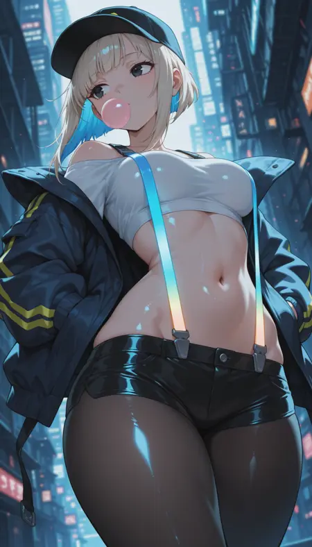 masterpiece, best quality, amazing quality, 4k, very aesthetic, high resolution, ultra-detailed, absurdres, newest, scenery, colorful, saturated, anime, anime coloring, very awa, 1girl, oversized baseball cap, platinum blonde hair, blue inner hair, inverted bob, long sidelocks, floating hair, black eyes, looking away, chewing gum, medium breasts, dark blue open jacket, off-shoulder, crop top white shirt, (glowing suspenders:1.3), midriff, navel, wide hips, huge butt, thick thighs, skindentation (lowleg:1.2) black latex short shorts, hip bones, hip dips, black pantyhose, hands in jacket pockets, walking, arched back, twisty pose, head tilt, wide shot, cowboy shot, from below, dutch angle, dynamic, foreshortening, face focus, fine fabric emphasis, shiny skin, cyberpunk, neon backlighting, dark, BREAK, depth of field, volumetric lighting