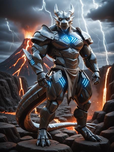 (mecha:1.1), (cybrog), anthro, dragon, male, black body, silver torse, shiny, full body, Muscle, Delicate face, Delicate eyes, 1 tail, glowing LED:1.1, energy, digitigrade, outdoors, (thunder), barazoku, hyper muscle, outside, (volcano), loincloth, lava, (armor), lighting, sky,