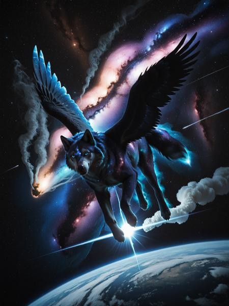 (feral:1.3), wolf, colorful, (galaxy), (nebula), stars, smoke, iridescent, intricate detail, in the shape of a wolf, full body, (space:1.1), (star sky:1.3), (midair), (flying:1.3)