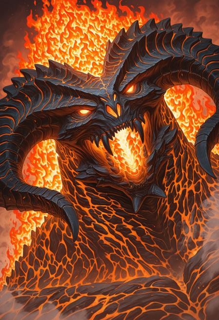 male focus, 1boy, solo, b4lr0g, no humans, horns, glowing eyes, monster, sharp teeth, close-up, fire, dutch angle, smoke, painting \(medium\), fantasy, fire background, thick fog,