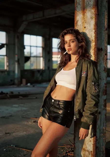 golden hour in a huge abandoned industrial warehouse, dust rays through broken windows, 23-year-old gorgeous brunette leaning back against a rusty metal pillar, one foot up on wall, wearing super short black hotpants unbuttoned at the top, white ribbed sports bra cropped high showing underboob, open matte-green bomber jacket with patches sliding off shoulders, cigarette dangling from lips, direct confident stare at camera, warm hard side light carving deep shadows and golden glow on skin, rich teal-orange cinematic grading, film grain, shot on 35 mm anamorphic 50 mm, shallow depth of field, pure 90s action movie heroine vibe, hyper-realistic skin and leather texture, 8k film scan look --ar 2:3 --stylize 850 --v 6 --brunette warehouse --black leather hotpants white sports bra open green bomber --golden hour hard light --cigarette