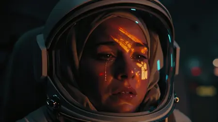 cinematic,A close-up of a woman looking up with a furrowed brow, illuminated by warm, dramatic lighting. Her expression conveys intensity or concern, with shadows adding depth to the emotional atmosphere, film grain, Short telephoto focal length, shot on ALEXA 65