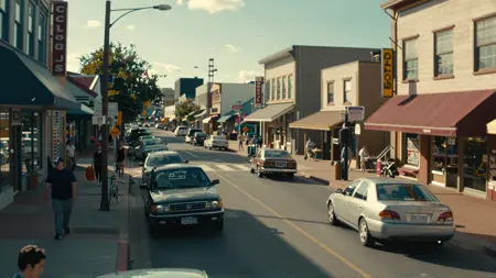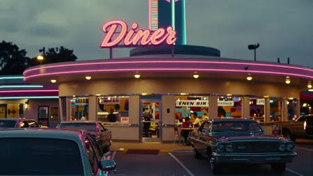 cinematic shot of a retro diner illuminated by glowing neon signs in evening light, classic drive-in style architecture with large awning casting warm glow over parked cars below, calm suburban street environment with soft ambient lighting from streetlamps and distant buildings, few people visible near entrance — one person walking toward door, another seated at outdoor table under awning, nostalgic and vibrant atmosphere conveyed through saturated neon colors (pink, blue, orange) against muted twilight sky, shallow depth of field focusing on diner facade and foreground cars, short telephoto focal length creating compressed perspective with natural lens flare from neon lights, shot on ALEXA 65 with visible film grain texture, no text or signage beyond what is part of the diner’s design (e.g., “Diner” sign in retro font), background details include vintage car models and faded chrome trim, no additional characters or action beyond implied quiet activity.