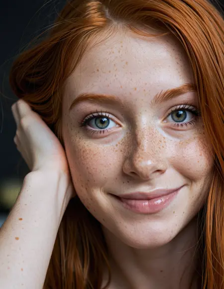 beautiful girl, smile, happy, close up, (detailed eyes:0.8), (looking at the camera:1.4), interior, (ginger hair:1.3), dark studio, muted colors, freckles