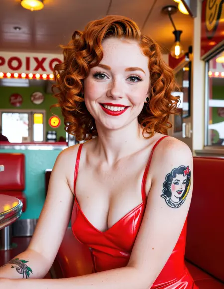 young ginger-haired woman, fair skin, vibrant curly hair, seated with natural joyful smile, playful fashion revealing expressive tattoos, vintage 1950s diner interior with cozy booths and chrome accents, soft cinematic bokeh framing retro details, dynamic angle capturing charm and spontaneity, vibrant Portra 400-style color grading, warm nostalgic lighting, visible skin texture and fine facial details, ultra-realistic portrait style