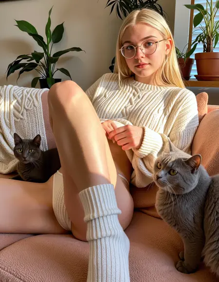 sdxl_ellasfre, sitting lazy on couch surrounded by cats, nerdy glasses, wearing an oversized knit sweater, cotton panties, top-down angle, ambient lamplight, quiet living room with soft blankets and plants, peaceful indoor realism