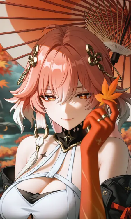 1girl,changli \(wuthering waves\),wuthering waves,bare shoulders,black collar,blurry,blurry foreground,body markings,braid,collar,eyes visible through hair,hair between eyes,hair extensions,hair ornament,hair over one eye,halterneck,leaf,looking ahead,maple leaf,multicolored hair,oil-paper umbrella,orange eyes,pink hair,portrait,ring hair extensions,sidelocks,smile,solo,twin braids,two-tone hair,umbrella,water,white hair,white umbrella,streaked hair,ahoge,tacet mark \(wuthering waves\),red hands,colored extremities,very long hair,black sleeves,hand up,maple leaf print,detached sleeves,long hair,holding,closed mouth,holding leaf,autumn leave,shade ,masterpiece, best quality, absurdres, newest, anime screenshot,very aesthetic, amazing quality,highres,sensitive,complex background, highres, ultra detailed, best anatomy,anime coloring, HDR, 8K, high detail RAW color art, high contrast,