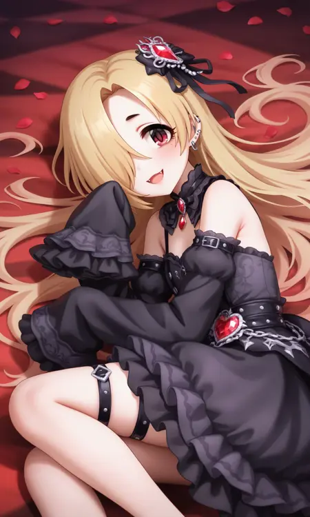1 girl, 18 years old, nose blush, tongue out, extremely beautiful face, perfect face, frilled black backless sleeveless dress, pink hair, crimson eyes, red eyelashes, very long hair, head lift, abstract background, from above, from side, close up, ,masterpiece, best quality, absurdres, newest, very aesthetic, amazing quality,highres,sensitive, highres, ultra detailed, best anatomy, HDR, 8K, high detail RAW color art, high contrast, large pupil,