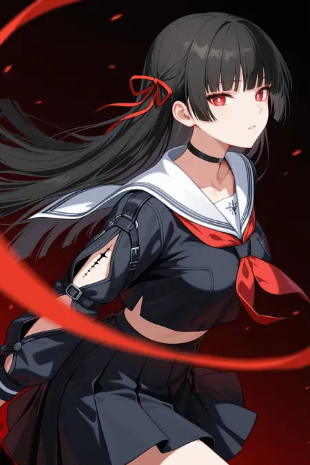1girl, chisa \(wuthering waves\), arm cutout, black choker, black hair, black shirt, black skirt, breasts, bright pupils, choker, clothing cutout, cowboy shot, dynamic pose, motion blur, from side, hair ribbon, long hair, long sleeves, looking at viewer, medium breasts, mole, mole under eye, neckerchief, parted lips, red eyes, red neckerchief, red ribbon, ribbon, sailor collar, school uniform, serafuku, shirt, skirt, solo, tacet mark \(wuthering waves\), white pupils, white sailor collar,
