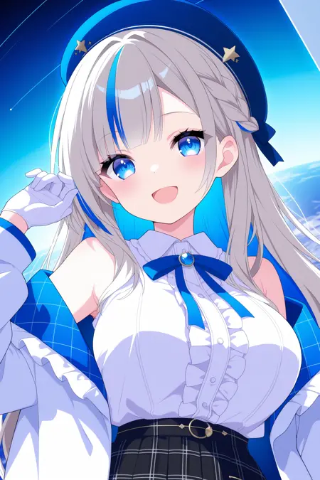 1girl,:d,amagai_ruka,beret,black_skirt,blue_coat,blue_eyes,blue_hair,blue_hat,blue_ribbon,blue_streaks,breasts,center-flap_bangs,center_frills,coat,collared_shirt,colored_inner_hair,frilled_coat,frills,gloves,grey_hair,half_crown_braid,hand_up,hat,hell_fuuna,highres,large_breasts,long_hair,looking_at_viewer,miniskirt,multicolored_hair,neck_ribbon,off_shoulder,open_mouth,plaid_clothes,plaid_skirt,pleated_skirt,ribbon,shirt,shirt_tucked_in,skirt,smile,solo,streaked_hair,virtual_youtuber,weather_planet,white_gloves,white_shirt