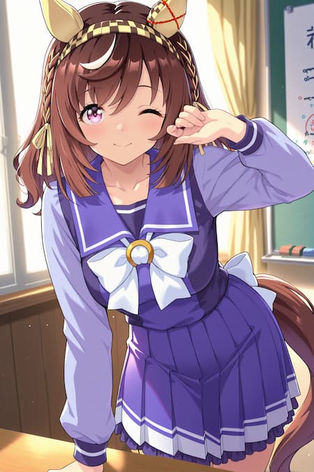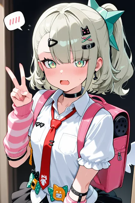 Negative prompt: (worst quality, low quality: 1.3), (monochrome, grayscale, bad hands, watermark, username: 1.2), (nsfw, midriff, hat, desk: 1.1), (forehead:1.4), text, bare legs,