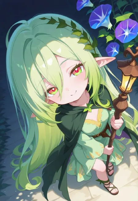 (dark green cape:1.2), (light green robe:1.2), big puff sleeve, ivy belt, (holding a staff:1.2), sandals, Lantern,
