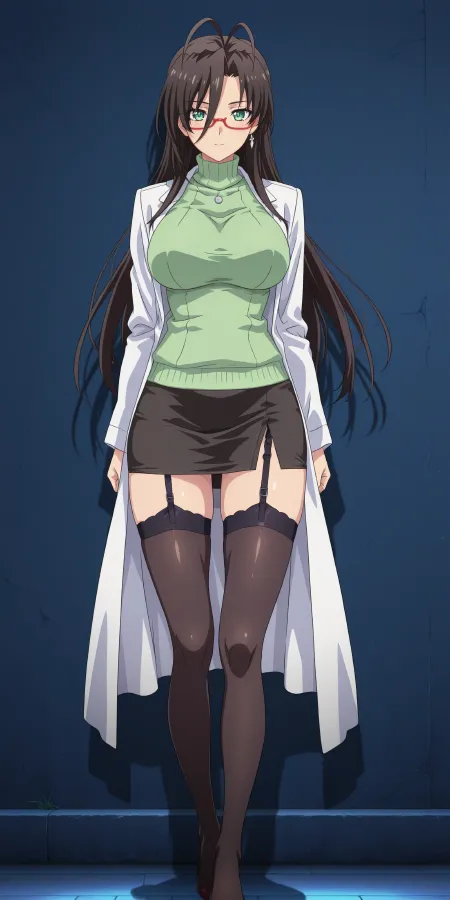 thighhighs, skirt, glasses, red-framed eyewear, sweater, garter straps, labcoat,