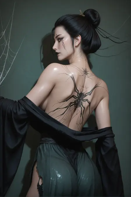 dramatic chiaroscuro,mystical dark ambiance,oriental gothic elegance,dark fantasy,spider silk,chinese-inspired outfit,dark,bare legs,upper_body,torn clothes,sideboob,spider silk,green_background,shadow,silhouette,(big breasts:0.5),