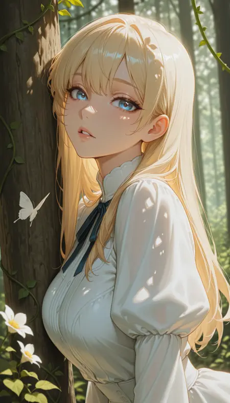 masterpiece, best quality, amazing quality, very aesthetic, high resolution, ultra-detailed, absurdres, newest, scenery,(dappled sunlight:1.2), rim light, backlit, dramatic shadow, 1girl, long blonde hair, blue eyes, shiny eyes, parted lips, medium breasts, puffy sleeve white dress, forest, flowers, white butterfly, looking at viewer, leaning side against tree, vines, green, arms, upper body, close-up, dutch angle, shiny skin, BREAK, eyes, lips, dramatic shadow, detailed eyes, detailed hair, depth of field, vignetting, volumetric lighting