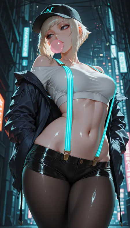 masterpiece, best quality, amazing quality, 4k, very aesthetic, high resolution, ultra-detailed, absurdres, newest, scenery, very awa, neon rim light, dark, 1girl, medium breasts, wide hips, huge butt, thick thighs, skindentation (lowleg:1.2) black latex short shorts, black pantyhose, crop top white shirt, (glowing neon suspenders:1.2), dark blue open jacket, off-shoulder, platinum blonde,inverted bob, sidelocks over shoulder,cowboy shot,from below, dutch angle, shiny dark eyes,looking away, hands in jacket pockets, oversized baseball cap, chewing gum, face focus, fine fabric emphasis, dynamic walking pose, twisty pose, head tilt, navel, wide shot, shiny skin, cyberpunk, BREAK, eyes, detailed eyes, depth of field, volumetric lighting