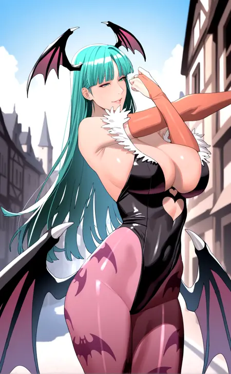 cowboy shot,outdoors,sunny,european architecture,town,street,morrigan aensland,green hair,long hair,blunt bangs,green eyes,head wings,bat wings,low wings,demon wings,elbow gloves,strapless leotard,bat print,print pantyhose,fur trim,bridal gauntlets,clothing cutout,heart cutout,highleg leotard,boots,standing,leaning back,stretching