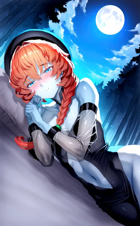 van gogh (second ascension) (fate), bare shoulders ,black dress ,black hat ,blue eyes,blue skin ,blush ,braid, center opening ,colored skin, hat, long hair,looking at viewer ,lying ,navel ,on side, orange hair ,puffy sleeves ,see-through clothes ,see-through sleeves ,side braid,view from below,backlighting, detailed cloudy sky, forest, night, deep night, trees, moon rays, moon,