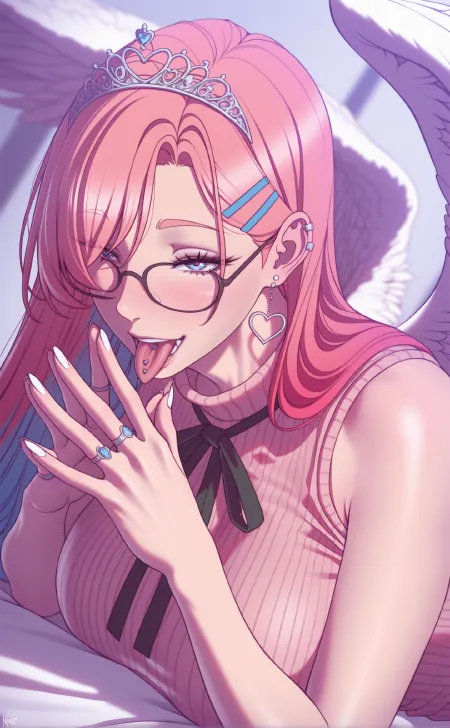 masterpiece, best quality, high score, great score, ultra-detailed, intricate details, very aesthetic, newest, hires, absurdres, <lora:checkpoint-e18_s576:1>, manhwa, 1girl, solo, medium hair, black hair, bob cut, blunt bangs, grey eyes, glasses, black-framed eyewear, fingernails, portrait, blush, looking at viewer, open mouth, tongue out, finger to mouth, simple background, white background