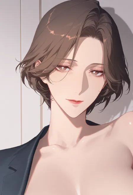 short hair,brown hair,brown eyes,bright pupils,(lowered eyelids:1.2),