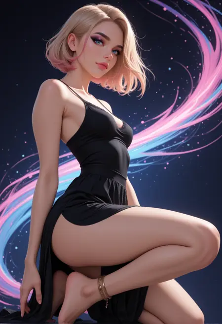 8K, depth of field, focused subject, dynamic angle, sexy pose, best quality, detailed eyes, perfect eyes, realistic eyes, blonde hair, pink highlights, loose curls, long hair, blue eyes, (mascara), pink makeup, slim body, , small ass, small breast, realistic breast, (black tube top), tube top, braless, (black leggings), BREAK, crouching, one knee up, front view, looking at viewer, movie perspective, white background, fractal background, abstract background, dynamic background,