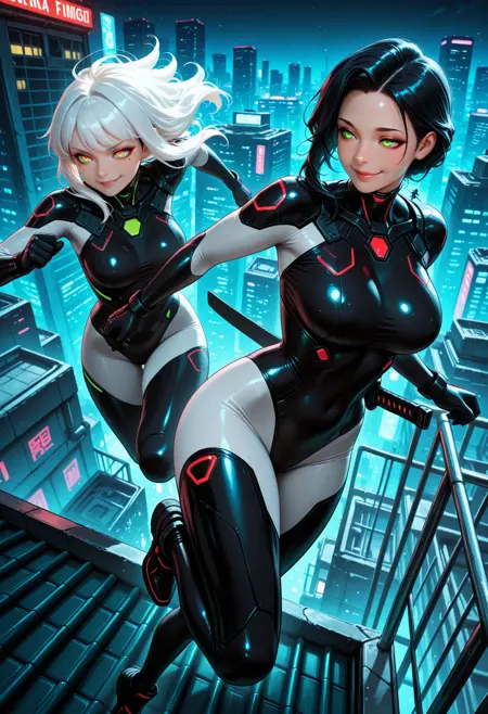 SmoothNoob_Quality, realistic, realistic textures, 1girl, mecha suits, mecha exoskeleton, augmented bodyparts, robotic bodyparts, black armor, neon silver lights, glowing visor, glowing armor, fighting stance, cityscape,
