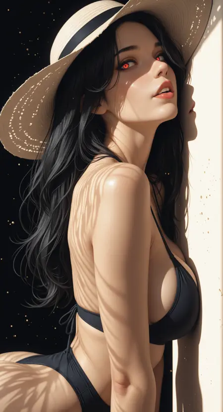 female,fair_skin,black hair,medium hair,bangs,black eyes,long_eyelashes,lipstick,oval face,huge breasts,cleavage,hoop_earrings,sun_hat,blush,looking_at_viewer,beach,ocean,drinking straw in mouth,holding drink,thong_bikini,, HDR,masterpiece,best quality,amazing quality,very aesthetic,intricate detail,perfect quality,highly detailed,vibrant,ambient occlusion,dynamic lighting,raytracing,newest,