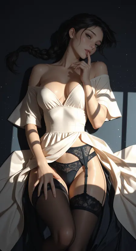 lying, hand on inner thigh, seductive, one side off the shoulder, leg bent, finger on lips, nuzzling, sly