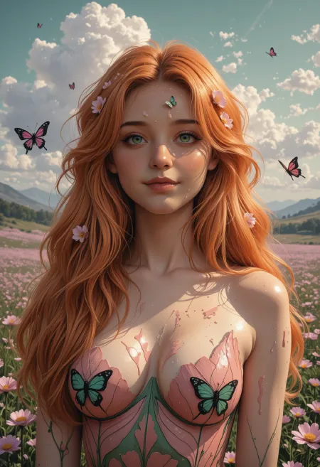 1girl, solo, ginger_hair, fluffy_hair, voluminous_hair, pale_skin, looking_up, gentle_smile, body_dissolving, into_clouds, double_exposure, semi_transparent, impasto, thick_paint, terracotta, muted_pink, pale_green, washed_acrylic, meadow_background, fog, cloud_shape, butterfly_silhouette, flower_forms, soft_light, volumetric_light, ethereal, dreamy_atmosphere, stylized