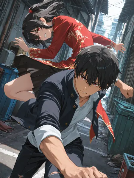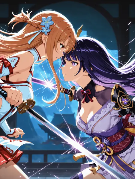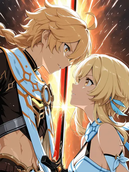 unholy-aesthetic, An intense anime-style action scene of two warriors Lumine and Aether from genshin impact locked in a fierce sword duel. Their glowing blades clash in a burst of sparks, faces inches apart as their eyes burn with determination. The dramatic lighting highlights flowing hair and expressive features, while the energy of the battle crackles in the air. The close-up composition captures the tension of the moment, with cinematic detail, high contrast, and a fantasy atmosphere. The background is detailed yet blurred just enough to keep focus on the epic confrontation, making the clash of steel feel alive and powerful, looking at each other