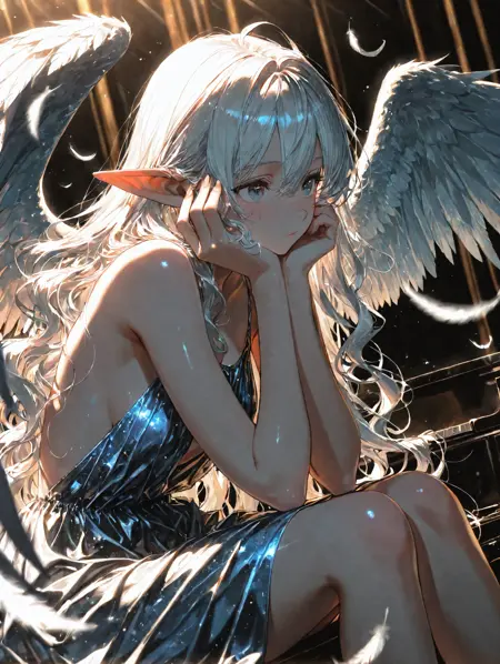 (solo:1.4,1girl),(artist:mazjojo:0.83), (artist:pigeon666:0.67), (artist:zawar379:0.77), (artist:remsrar:0.65), (artist:yoneyama mai:0.74), (artist:chimmyming:0.72), (artist:mazjojo:0.83), (artist:pigeon666:0.67), (artist:zawar379:0.77), (artist:remsrar:0.65), (artist:yoneyama mai:0.74), (artist:chimmyming:0.72), (artist:mazjojo:0.83), (artist:pigeon666:0.67), (artist:zawar379:0.77), (artist:remsrar:0.65), (artist:yoneyama mai:0.74), (artist:chimmyming:0.72), high resolution, goldenfieldszho, perfect lighting, volumetric lighting, (dark lighting), shadowing, (good shadowing), depth of field, scenery, cinematic lighting, cinematic, shading, (good shading), counter_shading, subsurface scattering, intricate details, illustration, perfect hands, pale skin, white hair, long wavy hair, celestial wings, ethereal shine wings, light, light refraction, (((spread wide wings, Fullscreen, multiple wings))), elf ears, sitting, knees apart, head bowed, head on hands, hidden face, hair over face, shirtless), basic background, motion blur, (dutch angle:1.1), (depth of field:1.3), (blurry edges:1.5), (medium\), tesun \(g noh\).