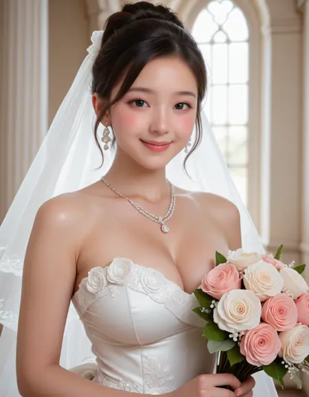 (masterpiece, best quality), (photo realistic, ultra detailed, realistic skin), (ultra high res, 8k, very aesthetic, absurdres) BREAK 1 girl, blush, dark-brown hair, updo, black eyes, (large breast:0.6), smile, leaning forward, cowboy shot, (white satin fabric, short-sleeved, long-length Chinese dress, brocade pattern:1.3), look at viewer, (Chinese window), in focus with blurred background