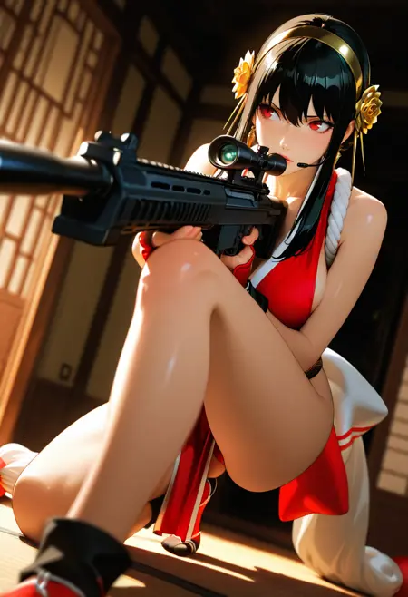 (weapon rest over shoulder:1.2), holding weapon, looking back,