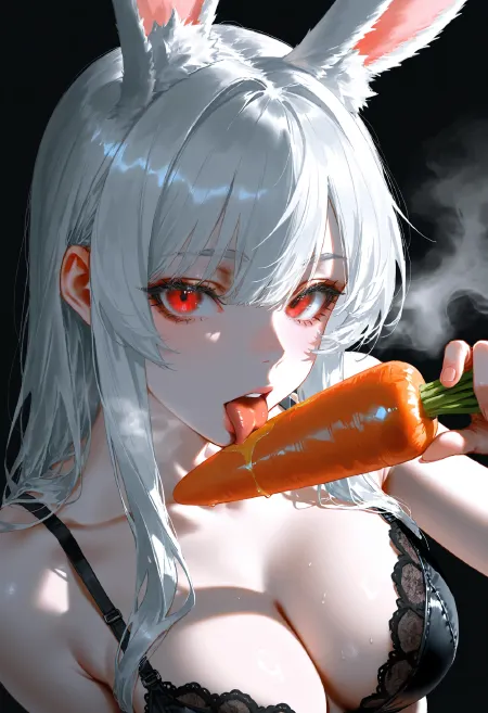 1girl,solo,white hair,long hair,red eyes,rabbit ears,animal ears,licking,carrot,food,black lingerie,lace,dark background,detailed eyes,seductive,steam,pale skin,big breasts,upper body,looking at viewer,(ebifurya:0.7),(artist:quasarcake:1.1),(artist:wlop:0.9),highres,sensitive,