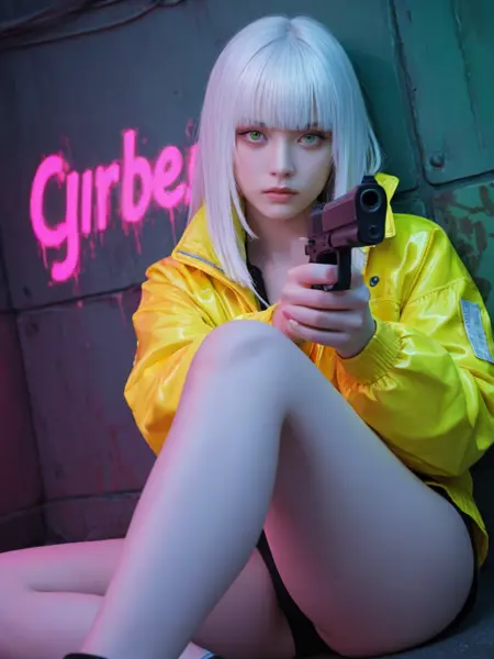 1woman, sideways glance, white hair, hime cut, yellow jacket, cyberpunk, tech wear, holding gun with one hand, aiming at viewer, knee up, pink and green neon colored graffiti wall, night, sitting on wall. view from side, (glitch), dynamic composition, dynamic angle. foreshortening.