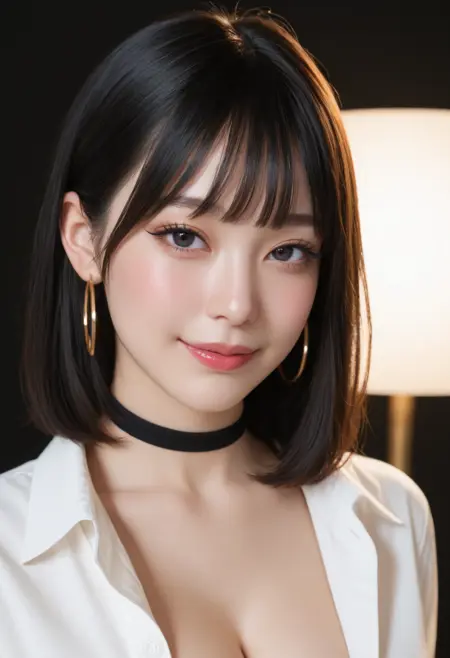 female,fair_skin,black hair,medium hair,bangs,black eyes,long_eyelashes,beautiful_detailed_eyes,cleavage,lipstick,oval face,white_collared_shirt,hoop_earrings,choker,looking_at_viewer,black_background,simple_background,blush,seductive_smile,, realistic,photorealistic,HDR,masterpiece,best quality,amazing quality,very aesthetic,intricate detail,perfect quality,highly detailed,vibrant,ambient occlusion,dynamic lighting,raytracing,newest,