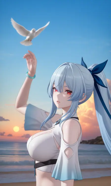 very aesthetic,1girl,bird,blue hair,blue ribbon,blue sky,blurry,blurry foreground,bracelet,breasts,clothing cutout,cloud,crop top,hair between eyes,hair ribbon,hand up,jewelry,large breasts,light blue hair,long hair,looking at viewer,ocean,outdoors,parted lips,red eyes,ribbon,sand,shirt,shoulder cutout,sidelocks,sky,solo,upper body,very long hair,white bird,white shirt,beach,floating hair,cloudy sky,arm up,blurry background,from side,water,bare shoulders,high ponytail,sunset,midriff,depth of field,gradient sky,,masterpiece,best quality,ultra-detailed,pale_skin,anime coloring, anime screencap,HDR,8K,high detail RAW color art,3D,unreal,(photo background:1.3),