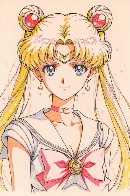 Colorful Line Art,1girl,tsukino usagi,solo,sailor moon,jewelry,sailor senshi uniform,long hair,magical girl,twintails,smile,sailor collar,gloves,earrings,hair bun,double bun,upper body,bow,crescent,crescent earrings,brooch,elbow gloves,sparkle,looking at viewer,tiara,circlet,hair ornament,closed mouth,traditional media,