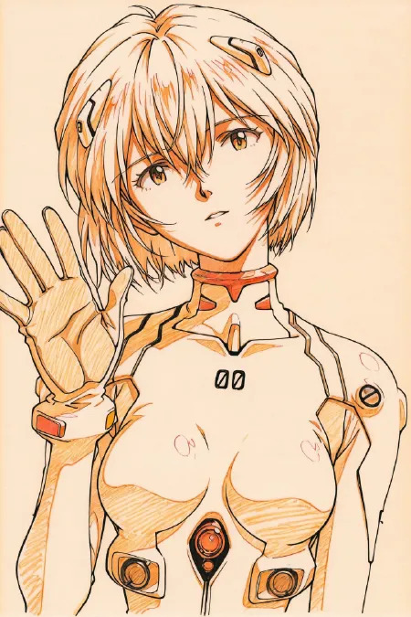 Colorful Line Art,1girl,ayanami rei,solo,plugsuit,short hair,bodysuit,monochrome,interface headset,head tilt,breasts,simple background,spot color,white background,hair between eyes,parted lips,gloves,headgear,white bodysuit,looking at viewer,hair ornament,